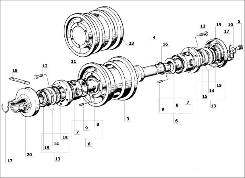 支重輪容易出現在問題是:A、輪體磨損。出現這種情況的原因是采用的鋼材不合格或者說材料熱處理時的硬度較低,耐磨性不足;B、漏油。支重輪軸通過軸套一直在旋轉,輪體內要加油來潤滑,但如果說密封圈不好的話,很容易產生漏油的現象,這樣軸與軸套在無潤滑的情況下,很容易磨損,造成產品無法進行使用。因此,支重輪密封的好壞是作為衡量生產公司產品質量的一個很重要的標準。
